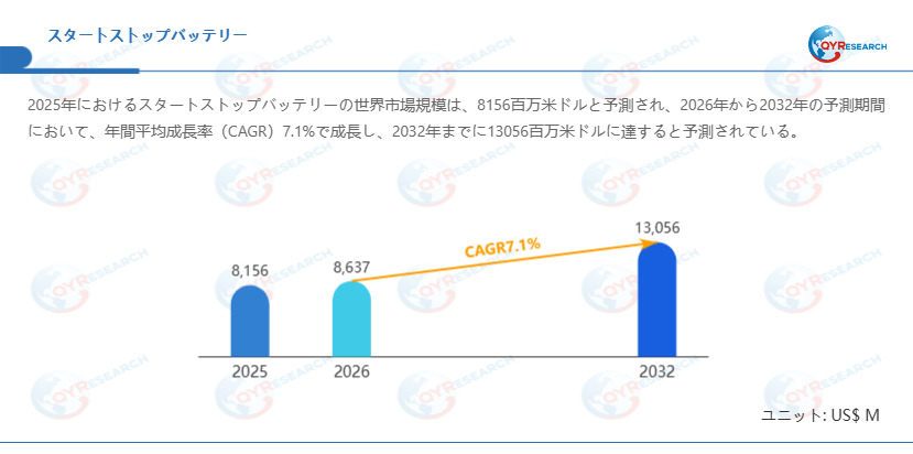 QYResearchが発表した新たな市場調査レポート「スタートストップバッテリー―グローバル市場シェアとランキング、全体の売上と需要予測、2026~2032」 によると、世界のスタートストップバッテリー市場規模は2025年の約8156百万米ドルから2026年の8637百万米ドルへと順調に拡大すると見込まれ、予測期間中は年平均成長率(CAGR)7.1%で成長し、2032年には13056百万米ドルに達すると予測されています。