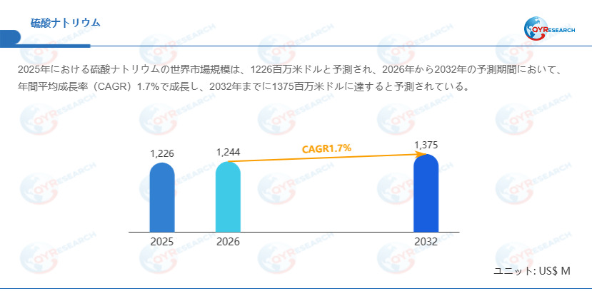 QYResearchが発表した新たな市場調査レポート「硫酸ナトリウム―グローバル市場シェアとランキング、全体の売上と需要予測、2026~2032」 によると、世界の硫酸ナトリウム市場規模は2025年の約1226百万米ドルから2026年の1244百万米ドルへと順調に拡大すると見込まれ、予測期間中は年平均成長率(CAGR)1.7%で成長し、2032年には1375百万米ドルに達すると予測されています。