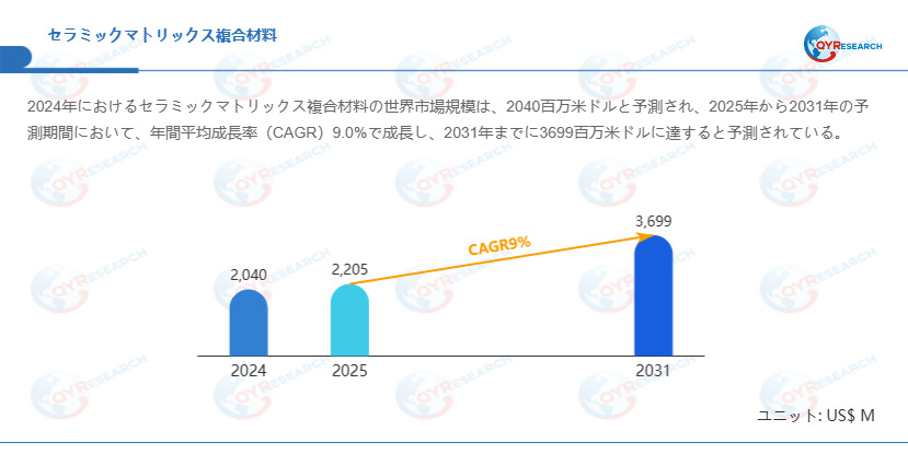 QYResearchが発表した新たな市場調査レポート「セラミックマトリックス複合材料―グローバル市場シェアとランキング、全体の売上と需要予測、2026~2032」 によると、世界のセラミックマトリックス複合材料市場規模は2024年の約2040百万米ドルから2025年の2205百万米ドルへと順調に拡大すると見込まれ、予測期間中は年平均成長率(CAGR)9%で成長し、2031年には3699百万米ドルに達すると予測されています。