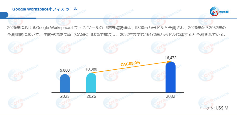 QYResearchが発表した新たな市場調査レポート「Google Workspaceオフィス ツール―グローバル市場シェアとランキング、全体の売上と需要予測、2026~2032」 によると、世界のGoogle Workspaceオフィス ツール市場規模は2025年の約9800百万米ドルから2026年の10380百万米ドルへと順調に拡大すると見込まれ、予測期間中は年平均成長率(CAGR)8.0%で成長し、2032年には16472百万米ドルに達すると予測されています。