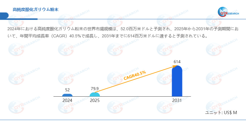 QYResearchが発表した新たな市場調査レポート「高純度酸化ガリウム粉末―グローバル市場シェアとランキング、全体の売上と需要予測、2026~2032」 によると、世界の高純度酸化ガリウム粉末市場規模は2024年の約52百万米ドルから2025年の79.9百万米ドルへと順調に拡大すると見込まれ、予測期間中は年平均成長率(CAGR)40.5%で成長し、2031年には614百万米ドルに達すると予測されています。