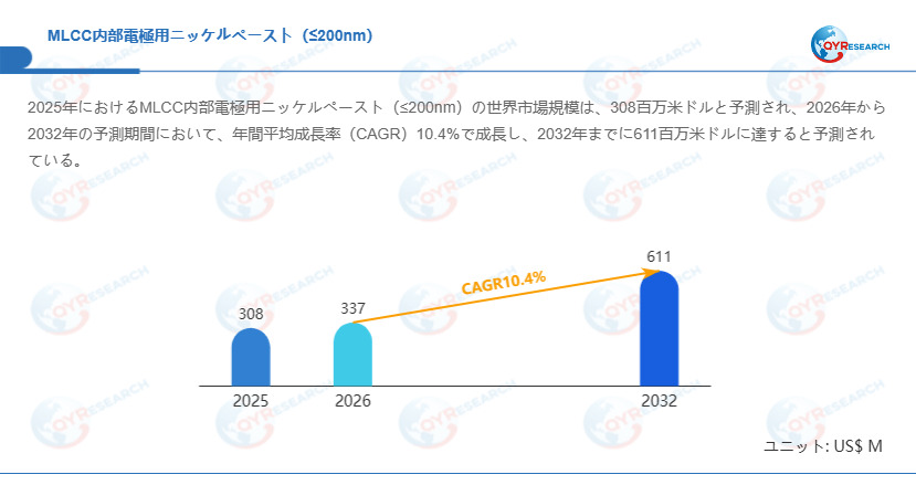 【最新予測】MLCC内部電極用ニッケルペースト(≤200nm)市場規模は2032年までに611百万米ドルへ、CAGR10.4%で拡大(QYResearch)