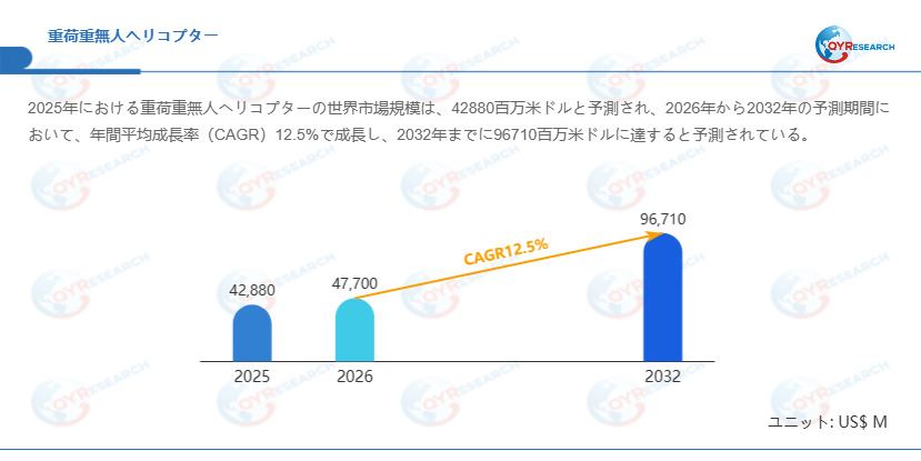 QYResearchが発表した新たな市場調査レポート「重荷重無人ヘリコプター―グローバル市場シェアとランキング、全体の売上と需要予測、2026~2032」 によると、世界の重荷重無人ヘリコプター市場規模は2025年の約42880百万米ドルから2026年の47700百万米ドルへと順調に拡大すると見込まれ、予測期間中は年平均成長率(CAGR)12.5%で成長し、2032年には96710百万米ドルに達すると予測されています。