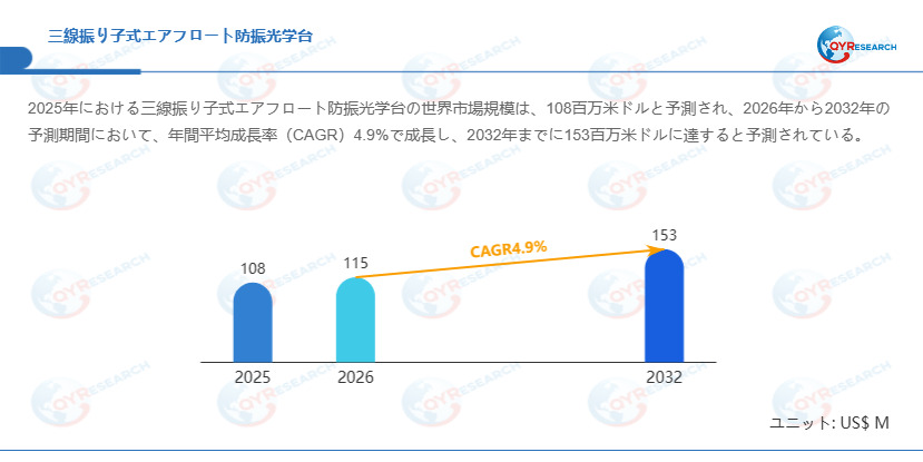 QYResearchが発表した新たな市場調査レポート「三線振り子式エアフロート防振光学台―グローバル市場シェアとランキング、全体の売上と需要予測、2026~2032」 によると、世界の三線振り子式エアフロート防振光学台市場規模は2025年の約108百万米ドルから2026年の115百万米ドルへと順調に拡大すると見込まれ、予測期間中は年平均成長率(CAGR)4.9%で成長し、2032年には153百万米ドルに達すると予測されています。