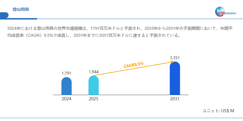 登山用具の世界市場規模は2025年から2031年にかけて年平均成長率(CAGR)9.5%で拡大し、2031年には3351百万米ドル規模に達する見込みです。市場は2024年に1791百万米ドルと推定され、2025年には1944百万米ドルに達すると予測されています。