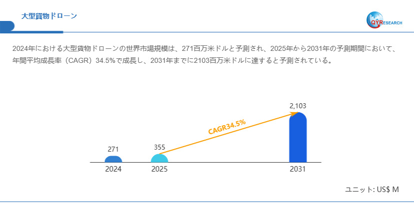 QYResearchが発表した新たな市場調査レポート「大型貨物ドローン―グローバル市場シェアとランキング、全体の売上と需要予測、2026~2032」 によると、世界の大型貨物ドローン市場規模は2024年の約271百万米ドルから2025年の355百万米ドルへと順調に拡大すると見込まれ、予測期間中は年平均成長率(CAGR)34.5%で成長し、2031年には2103百万米ドルに達すると予測されています。