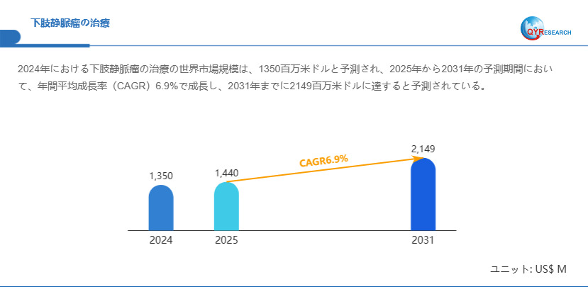 QYResearchが発表した新たな市場調査レポート「下肢静脈瘤の治療―グローバル市場シェアとランキング、全体の売上と需要予測、2026~2032」 によると、世界の下肢静脈瘤の治療市場規模は2024年の約1350百万米ドルから2025年の1440百万米ドルへと順調に拡大すると見込まれ、予測期間中は年平均成長率(CAGR)6.9%で成長し、2031年には2149百万米ドルに達すると予測されています。
