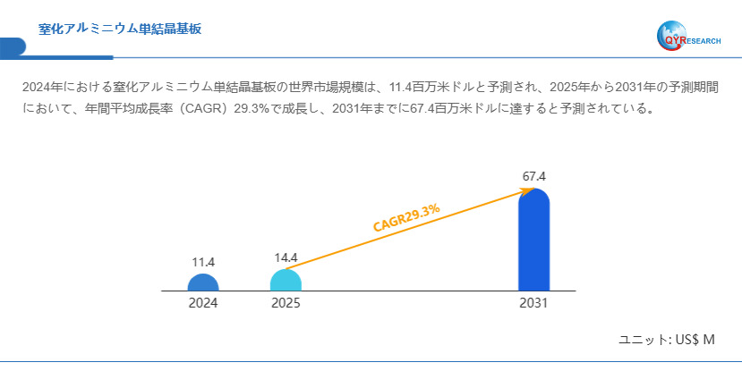 QYResearchが発表した新たな市場調査レポート「窒化アルミニウム単結晶基板―グローバル市場シェアとランキング、全体の売上と需要予測、2026~2032」 によると、世界の窒化アルミニウム単結晶基板市場規模は2024年の約11.4百万米ドルから2025年の14.4百万米ドルへと順調に拡大すると見込まれ、予測期間中は年平均成長率(CAGR)29.3%で成長し、2031年には67.4百万米ドルに達すると予測されています。