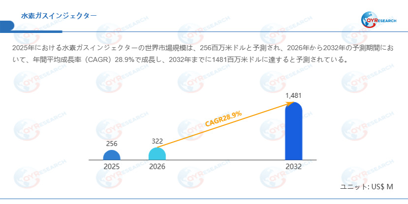QYResearchが発表した新たな市場調査レポート「水素ガスインジェクター―グローバル市場シェアとランキング、全体の売上と需要予測、2026~2032」 によると、世界の水素ガスインジェクター市場規模は2025年の約256百万米ドルから2026年の322百万米ドルへと順調に拡大すると見込まれ、予測期間中は年平均成長率(CAGR)28.9%で成長し、2032年には1481百万米ドルに達すると予測されています。