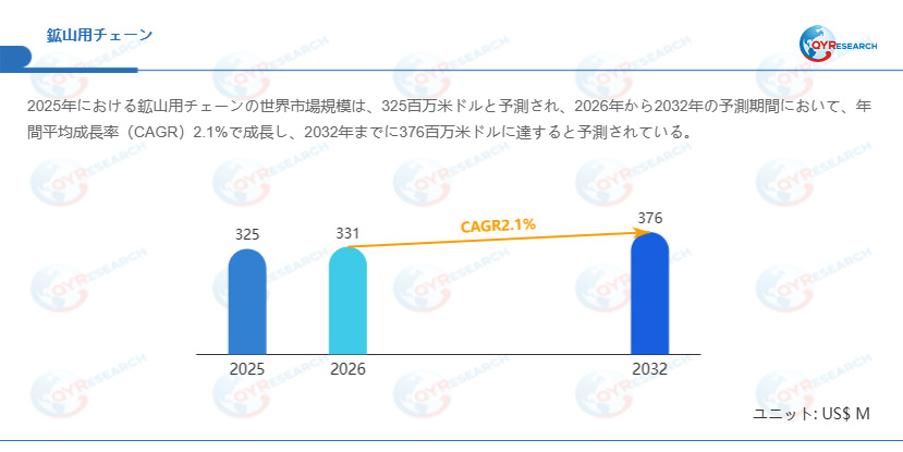 QYResearchが発表した新たな市場調査レポート「鉱山用チェーン―グローバル市場シェアとランキング、全体の売上と需要予測、2026~2032」 によると、世界の鉱山用チェーン市場規模は2025年の約325百万米ドルから2026年の331百万米ドルへと順調に拡大すると見込まれ、予測期間中は年平均成長率(CAGR)2.1%で成長し、2032年には376百万米ドルに達すると予測されています。