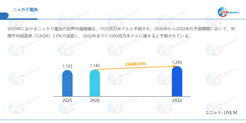 QYResearchが発表した新たな市場調査レポート「ニッカド電池―グローバル市場シェアとランキング、全体の売上と需要予測、2026~2032」 によると、世界のニッカド電池市場規模は2025年の約1123百万米ドルから2026年の1143百万米ドルへと順調に拡大すると見込まれ、予測期間中は年平均成長率(CAGR)2.0%で成長し、2032年には1285百万米ドルに達すると予測されています。