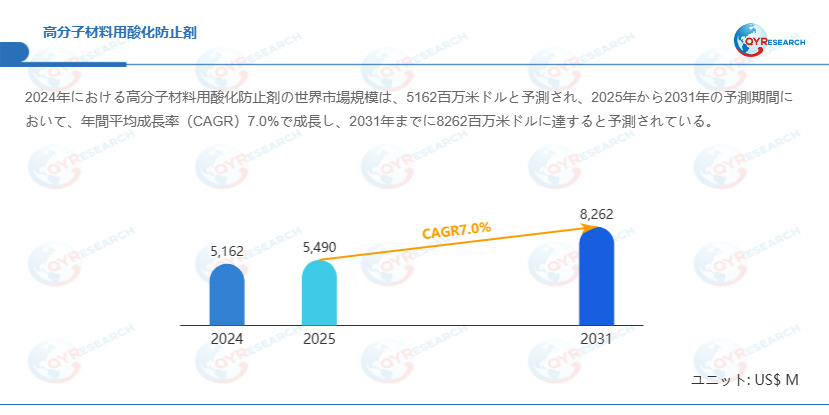QYResearchが発表した新たな市場調査レポート「高分子材料用酸化防止剤―グローバル市場シェアとランキング、全体の売上と需要予測、2026~2032」 によると、世界の高分子材料用酸化防止剤市場規模は2024年の約5162百万米ドルから2025年の5490百万米ドルへと順調に拡大すると見込まれ、予測期間中は年平均成長率(CAGR)7.0%で成長し、2031年には8262百万米ドルに達すると予測されています。