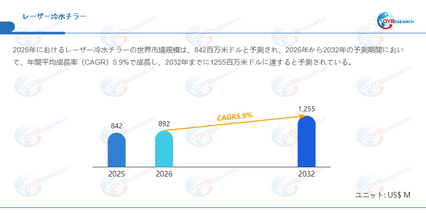QYResearchが発表した新たな市場調査レポート「レーザー冷水チラー―グローバル市場シェアとランキング、全体の売上と需要予測、2026~2032」 によると、世界のレーザー冷水チラー市場規模は2025年の約842百万米ドルから2026年の892百万米ドルへと順調に拡大すると見込まれ、予測期間中は年平均成長率(CAGR)5.9%で成長し、2032年には1255百万米ドルに達すると予測されています。