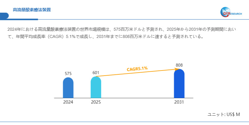 QYResearchが発表した新たな市場調査レポート「高流量酸素療法装置―グローバル市場シェアとランキング、全体の売上と需要予測、2026~2032」 によると、世界の高流量酸素療法装置市場規模は2024年の約575百万米ドルから2025年の601百万米ドルへと順調に拡大すると見込まれ、予測期間中は年平均成長率(CAGR)5.1%で成長し、2031年には808百万米ドルに達すると予測されています。