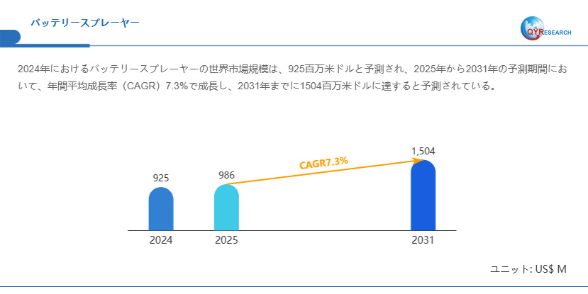 QYResearchが発表した新たな市場調査レポート「バッテリースプレーヤー―グローバル市場シェアとランキング、全体の売上と需要予測、2026~2032」 によると、世界のバッテリースプレーヤー市場規模は2024年の約925百万米ドルから2025年の986百万米ドルへと順調に拡大すると見込まれ、予測期間中は年平均成長率(CAGR)7.3%で成長し、2031年には1504百万米ドルに達すると予測されています。