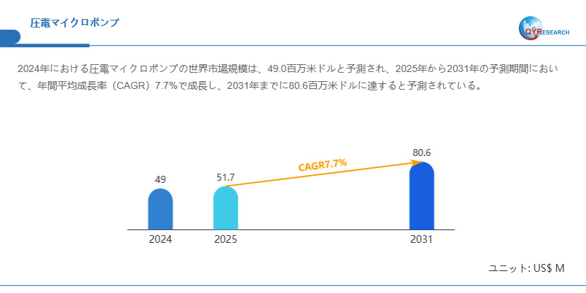 QYResearchが発表した新たな市場調査レポート「圧電マイクロポンプ―グローバル市場シェアとランキング、全体の売上と需要予測、2026~2032」 によると、世界の圧電マイクロポンプ市場規模は2024年の約49百万米ドルから2025年の51.7百万米ドルへと順調に拡大すると見込まれ、予測期間中は年平均成長率(CAGR)7.7%で成長し、2031年には80.6百万米ドルに達すると予測されています。