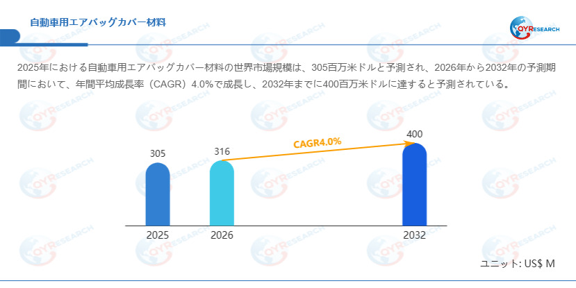 QYResearchが発表した新たな市場調査レポート「自動車用エアバッグカバー材料―グローバル市場シェアとランキング、全体の売上と需要予測、2026~2032」 によると、世界の自動車用エアバッグカバー材料市場規模は2025年の約305百万米ドルから2026年の316百万米ドルへと順調に拡大すると見込まれ、予測期間中は年平均成長率(CAGR)4.0%で成長し、2032年には400百万米ドルに達すると予測されています。