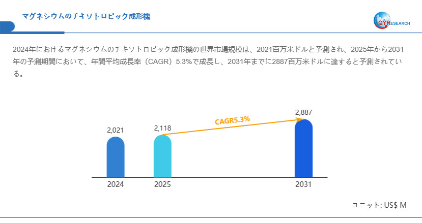 QYResearchが発表した新たな市場調査レポート「マグネシウムのチキソトロピック成形機―グローバル市場シェアとランキング、全体の売上と需要予測、2026~2032」 によると、世界のマグネシウムのチキソトロピック成形機市場規模は2024年の約2021百万米ドルから2025年の2118百万米ドルへと順調に拡大すると見込まれ、予測期間中は年平均成長率(CAGR)5.3%で成長し、2031年には2887百万米ドルに達すると予測されています。